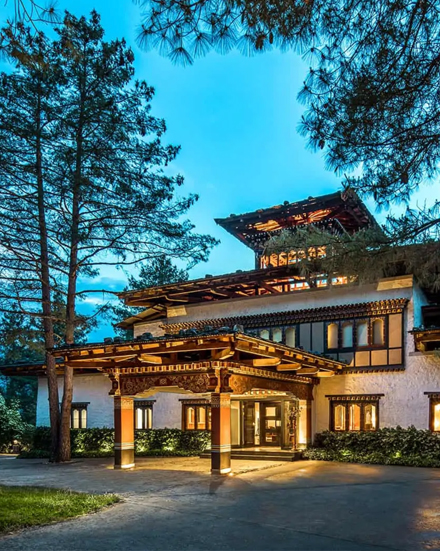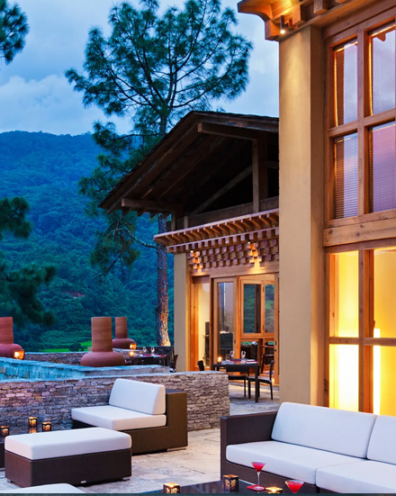 Uma Paro Resort in Bhutan harmoniously blends traditional Bhutanese architecture, breathtaking mountain views.